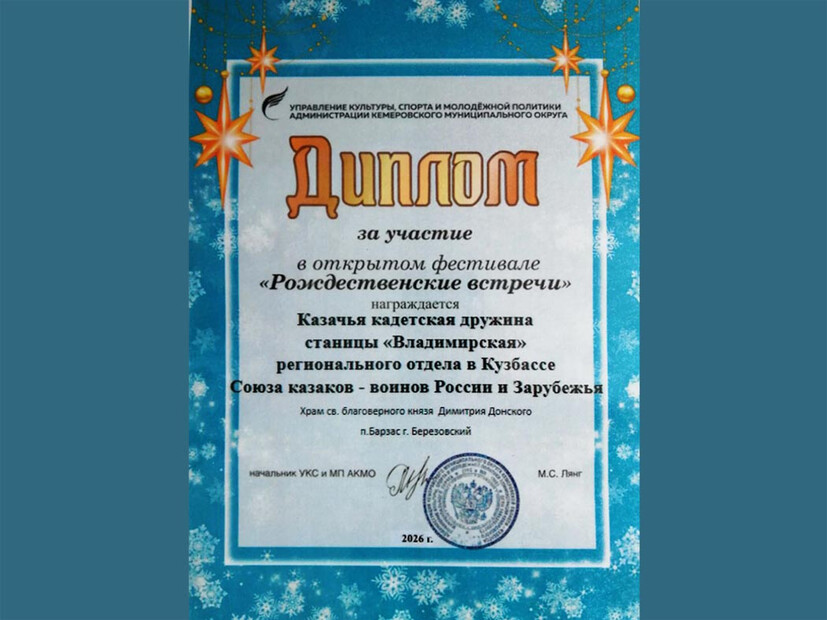 Выступление кадетов Казачьей кадетской дружины Регионального отделения СКВРиЗ в Кузбассе состоялось в рамках участия в открытом фестивале "Рождественские встречи", который прошёл в ДК Арсеньтьевки (п. Барзас г. Берёзопский, Кузбасс) 8 января 2026 г. Кроме кадетов также принял участие заместитель руководителя ККД урядник Касимов Андрей недавно отслуживший срочную службу. Небольшое видео с выступления можно увидеть по ссылке - нажав здесь. Юлия Калимова, | |