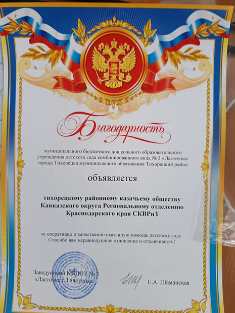 26.09.2025 г. казаки и Атаманы Тихорецкого РКО во главе с атаманом Кавказского округа РО КК СКВРиЗ по просьбе руководства МБДОУ № 3 "Ласточка" г. Тихорецка на безвозмездной основе и за счёт собственных средств, провели демонтажные и сварочные ремонтные работы металлического ограждения территории детского сада. Сотрудники детского сада поблагодарили казаков СКВРиЗ и выразили желание на дальнейшее сотрудничество в различных направлениях работы в их образовательном учреждении!