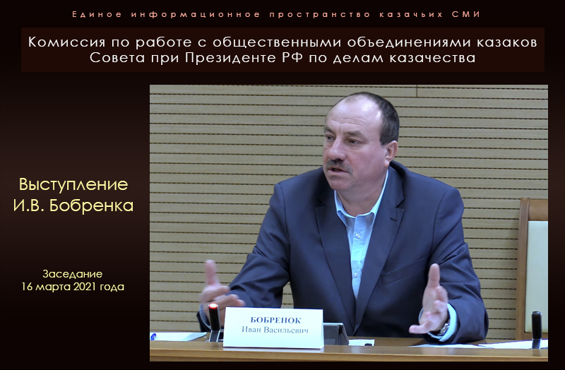 Выступление начальника главного штаба СКВРиЗ Ивана Бобренка на заседании постоянной комиссии по работе с общественными объединениями казаков Совета при Президенте РФ по делам казачества 16.12.2025г. Уважаемый Виктор Петрович! Ранее, в 2021 и в 2022 годах я уже делал доклады на этой комиссии по похожим темам. Был уверен, что нас услышат, примут к сведению, поправят что-то. Но нет. Приходится вновь и вновь возвращаться к этой теме. Весьма проблематично получать сведения с наших региональных отделений и представительств в настоящее время. Очень много казаков СКВРиЗ сейчас находятся в зоне проведения Специальной военной операции в составе добровольческих подразделений и в подразделениях Вооружённых Сил Российской Федерации. Участвовали или до сих принимают участие в СВО 26 атаманов региональных подразделений, 4 заместителя Верховного Атамана в федеральных округах. Верховный Атаман СКВРиЗ Николай Дьяконов является заместителем командира Добровольческого корпуса. Все наши структурные подразделения в первую очередь оказывают помощь нашим воинам, организовав сбор и доставку различного необходимого имущества в подразделения. Поэтому, к сожалению, какую-либо статистику по дорожной карте представить довольно затруднительно. Но СКВРиЗ с его структурными подразделениями и в современных условиях осуществляет деятельность по всем направлениям, направленную на выполнение Плана мероприятий («дорожной карты») по консолидации казачьих обществ и иных объединений казаков на 2023-2025 годы. Целью государственной политики Российской Федерации в отношении российского казачества является содействие консолидации российского казачества, сохранению, развитию, использованию духовного наследия и культуры казачества для обеспечения реализации его потребности в служении обществу посредством формирования эффективного механизма привлечения казачества к несению государственной или иной службы, участию в решении на основе общественно-государственного партнерства государственных задач в интересах национальной безопасности. Это положение стоит на первом месте. А что такое консолидация? Давайте посмотрим определение, которое дано в Большой российской энциклопедии 2004-2017. КОНСОЛИДА́ЦИЯ (позднелатинское consolidatio, от consolido – укреплять) есть процесс (акт, операция) трансформации структуры или состава некоторой системы, приводящий к уменьшению числа составных частей, повышению её компактности, эффективности, надёжности или долговечности. В социальной сфере Консолидация общественных групп или коллективов это укрепление внутренних связей между членами этих групп на базе формирования общих целей, взглядов, предпочтений, традиций. Первым пунктом Плана (дорожной карты) стоит «Заключение соглашений о взаимодействии между КО и ИОК». Наши показатели не поменялись с 2022 года. Количество соглашений за этот период не прибавилось и в настоящий момент составляет 34 в регионах и 6 с Войсковыми казачьими обществами. Заключение соглашений между СКВРиЗ и Войсковыми казачьими обществами осталось на том же уровне, что и раньше. Поменялись войсковые атаманы в Оренбургском войсковом казачьем обществе и в Сибирском войсковом казачьем обществе. Создано Северо-Западное войсковое казачье общество. Недавно я лично общался с избранным войсковым атаманом Оренбургског